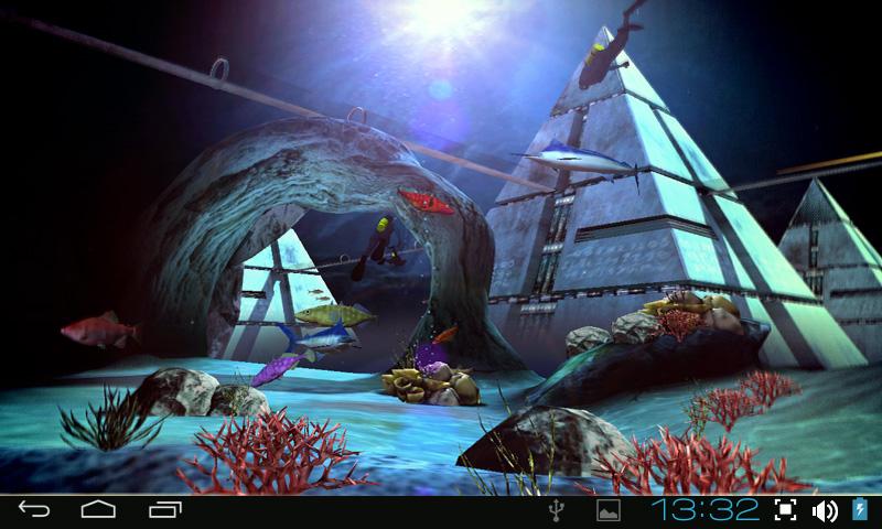 The most convincing underwater 3D live wallpaper on Google Play for your phone or tablet! Take a tour to legendary Atlantis with this photo realistic wallpaper! Fully 3d colorful and living environment, many species of fish, vegetation, mystery of ancient architecture and realistically animated divers, what going to discover Atlantis, make this live wallpaper extremely detailed and visually amazing.