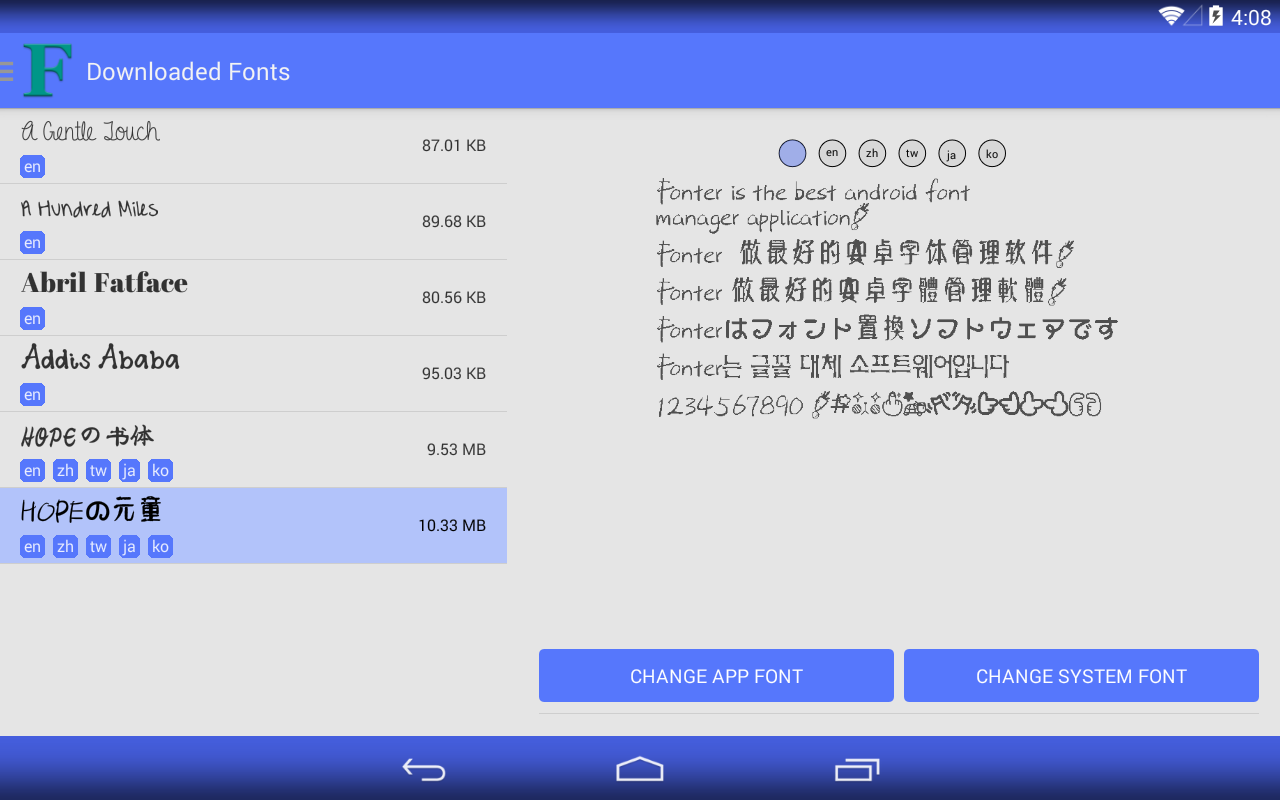 Overview: Fonter is the best font manager on Android,not only support CHANGE SYSTEM FONT also support CHANGE APP's FONT and post STYLED TWEET without 140 words limit, also have thousands of fonts for you.